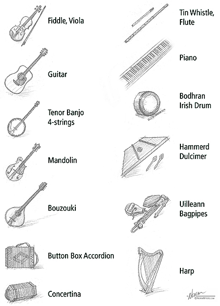 These are typical instruments found at a Session. Some Sessions are very strict as to what instruments and how many are played, and others are more open - it depends on the Session leader and those playing.